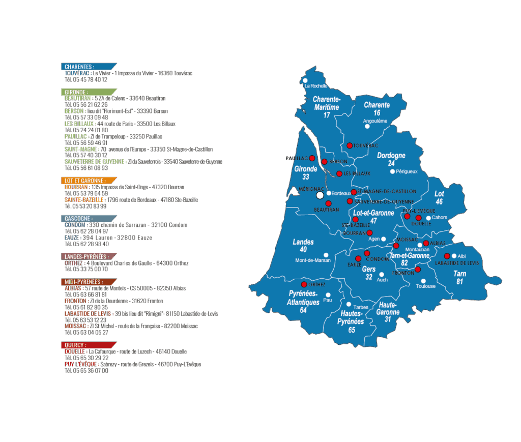 Contactez votre spécialiste en conseil et distribution d’agrofournitures en Nouvelle-Aquitaine et Occitanie Contactez-nous Formulaire simple avec téléphone Lieu * Albias (82)Beautiran (33)Berson (33)Bourran (47)Condom (32)Douelle (46)Dordogne (24)Orthez (64)Eauze (32)Fronton (31)Labastide de Lévis (81)Les Billaux (33)Mérignac (33)Moissac (82)Pauillac (33)Puy Lévèque (46)Saint Magne de Castillon (33)Sainte Bazeille (47)Sauveterre de Guyenne (33)Touvérac (16) Nom & Prénom * Téléphone * Email * Adresse * Code postal * Ville * Message * Envoyer Si vous êtes un humain, ne remplissez pas ce champ.
